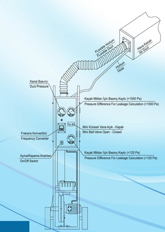 Şema(1)daki gibi ilk olarak test cihazı 2 tarafıda körlenmiş hava kanalının tek tarafına flexible hava kanalıyla ile hava kanalına bağlanır. Kaçak miktarını geri dönüşünü öğrenmek için test cihazından gelen hortum kanala bağlanır. Frekans Konvektöründen istenilen kanal basıncına kadar cihazın Hz yükseltilir. Uygulama alanı ve proje hesabına uygun olarak kanal basıncı ayarlanır. Kaçak miktarı için basınç kaybı(<1500 Pa) manometresinde okuduğumuz değer formüllerde Qkaçak bulmamıza yardımcı olacaktır. Kaçak miktarında okuduğumuz değer 125 Pa altında kalıyorsa mini küresel vana açılır ve Kaçak miktarı için basınç kaybı (<125Pa) manometresinden net ve doğru okuma yapılır.